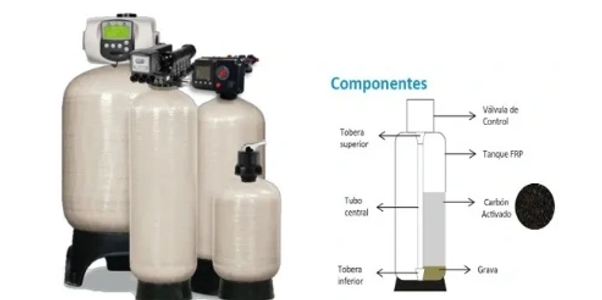 Nuestros filtros de carbón activado son sistemas para la remoción de cloro, componentes orgánicos, subproductos de la desinfección (cloraminas, THMs), trazas de metales pesados y otros